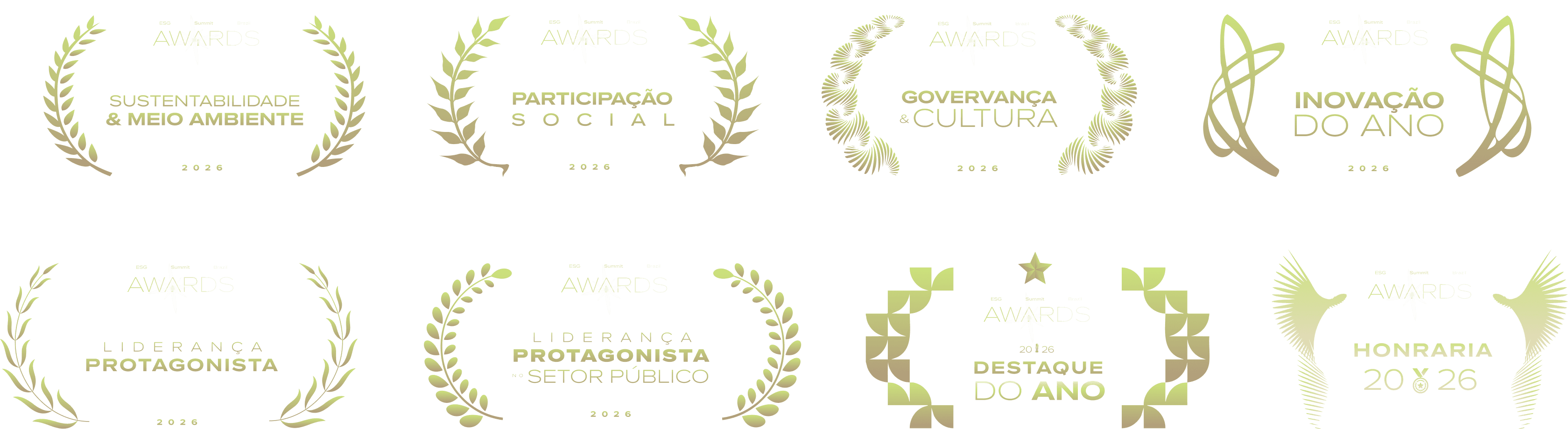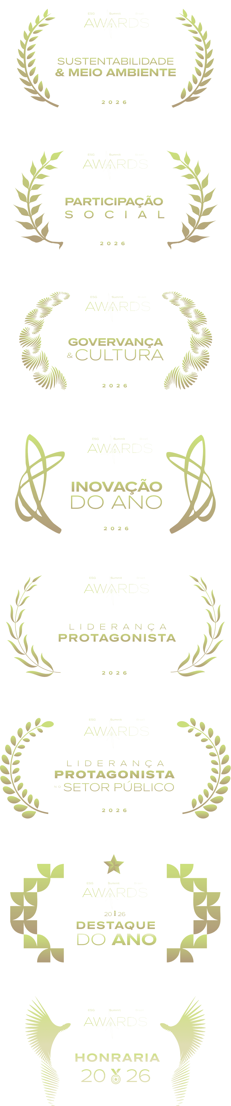 O Prêmio ESG Summit Brazil reconhece e premia organizações empresariais, públicas e líderes que demonstraram excelência nas áreas: Ambiental, Social e Governança (ESG). Concede ainda uma Honraria especial a cada edição, a uma grande personalidade de notórios serviços prestados ao Brasil. São até 03 finalistas para cada categoria e mais um título de honraria.